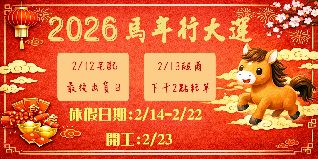 115/02/14(六)-02/22(日)連假期間暫停客服處理、問題回覆、訂單出貨等。